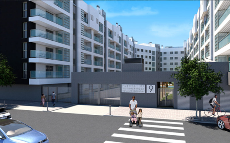 The PUERTA de VISTAHERMOSA residential complex is a model of residential homes inspired by the light of Levante, located in Alicante, with wide open spaces in an avant-garde environment of 115 homes with a garage, storage room, solarium, garden areas, and swimming pool.